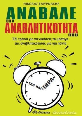Το παρεχόμενο κείμενο είναι αποσπάσματα από ένα ηλεκτρονικό βιβλίο του Νικόλα Σμυρνάκη με τίτλο «ΑΝΑΒΑΛΕ την ΑΝΑΒΛΗΤΙΚΌΤΗΤΑ σου», το οποίο διανέμεται δωρεάν υπό άδεια Creative Commons. Το βιβλίο προσφέρει έξι τρόπους για την καταπολέμηση της αναβλητικότητας, παρουσιάζοντας τις γενικές και ειδικές συνέπειες της αναβλητικότητας, καθώς και πρακτικές ασκήσεις όπως τη δημιουργία λιστών εκπληρώσεων, τη χρήση ενός «ξυπνητηριού αναβλητικότητας» και την επίτευξη μικρών, άμεσων νικών. Ο συγγραφέας μοιράζεται προσωπικές εμπειρίες και παραδείγματα πελατών για να τονίσει την αποτελεσματικότητα των στρατηγικών του, οι οποίες βασίζονται στη φιλοσοφία του «Ανθρώπου στο ΝηΣί». Τέλος, το κείμενο περιλαμβάνει βιογραφικές πληροφορίες για τον συγγραφέα και προωθεί τις υπηρεσίες coaching και σεμινάρια του, με στόχο την προσωπική ανάπτυξη και την επίτευξη της επιτυχίας και της ευτυχίας.
